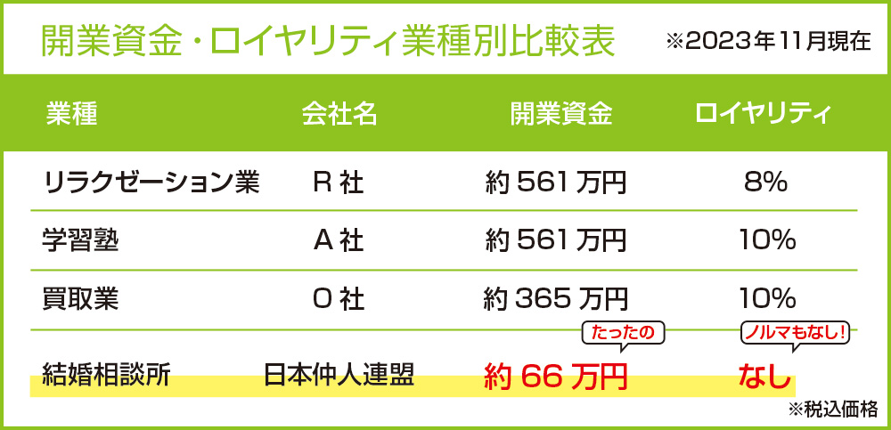 結婚相談所には特別な設備や日々の仕入れが必要ないので、飲食店や小売店、学習塾などと比べても低コストで開業・運営が可能です。
