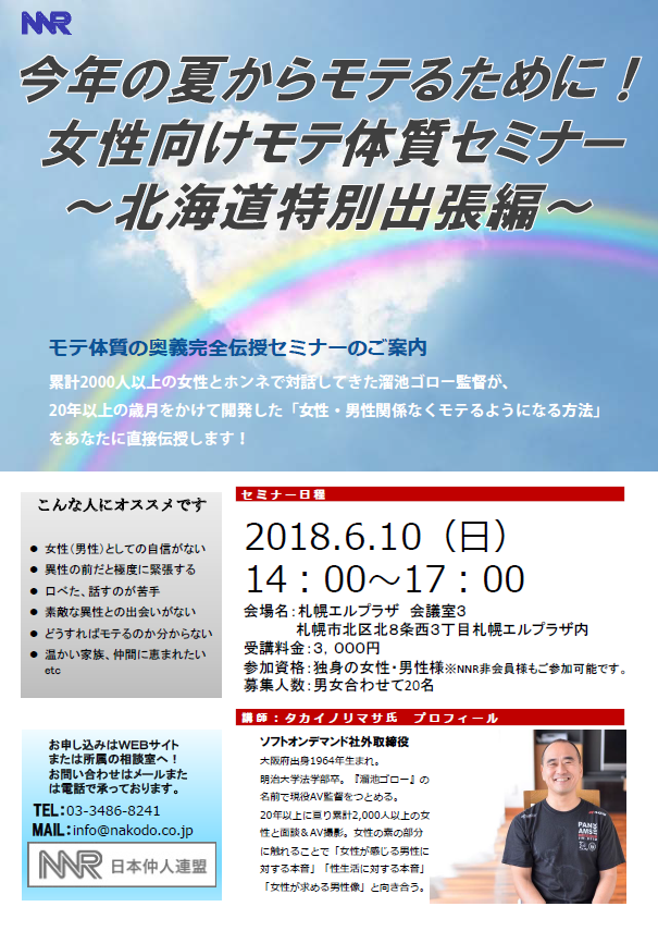 NNRで大好評をいただいているモテ体質セミナーを特別開催。普段は男性向けの内容ですが、女性向けにアレンジしてお届け!さらに!通常は東京での開催ですが、今回は北海道で行います。