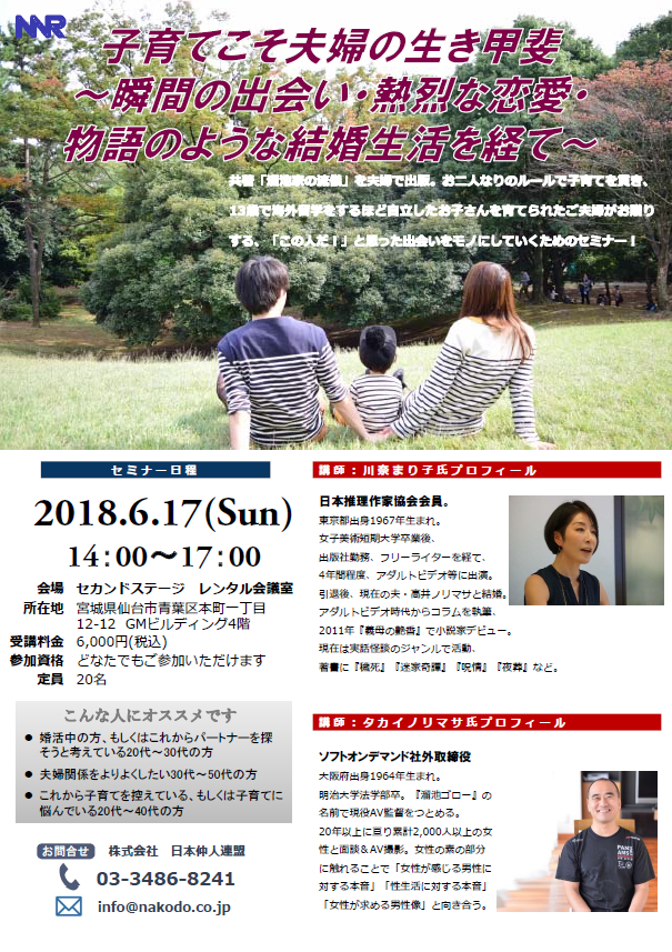6/17(日)仙台にてセミナー開催!~子育ての楽しさを共著で出版している夫婦から学ぶ~