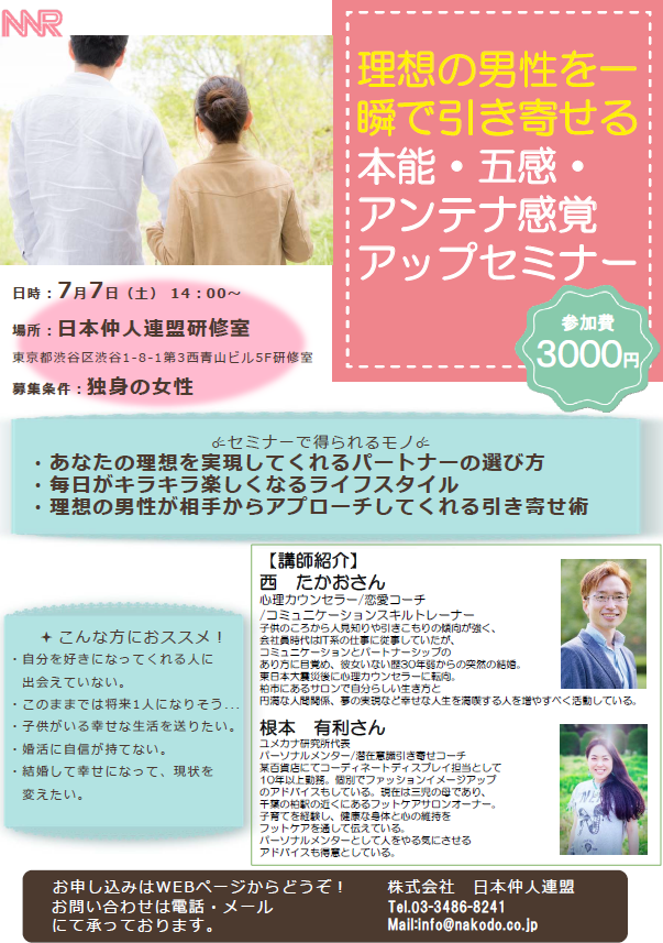 7/7(土)東京渋谷にて女性向けセミナー開催!理想の相手の見つけ方