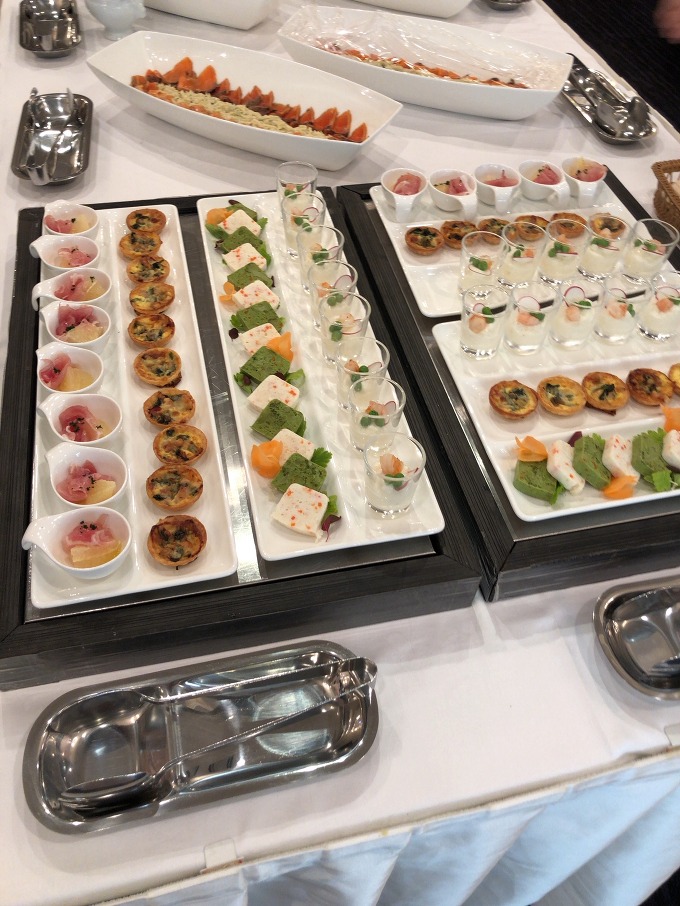 結婚式場でのパーティ。食べ物がテーブルに並びます。パーティの開始からほどなく、次第に女性に食事を運ぶ男性の姿や、盛り上がる会話が各所で見られるようになりました。