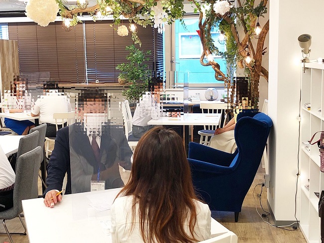 始めにパーティの進行方法などの流れと注意事項を説明。目の前にお座りになっているお相手と1×1で5分間の個別トークで男性にお席の移動をしていただきました。自己紹介を含めプロフィールカードを交換しながらの会話で、お一人おひとりとじっくりコミュニケーションがとれたのではないでしょうか。参加男性が1名多いため、男性は1度待ち時間ができましたが、その間は休憩も兼ねてお待ちいただきました。